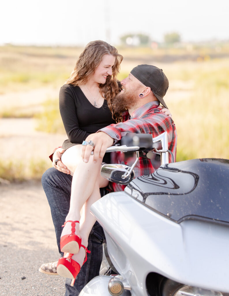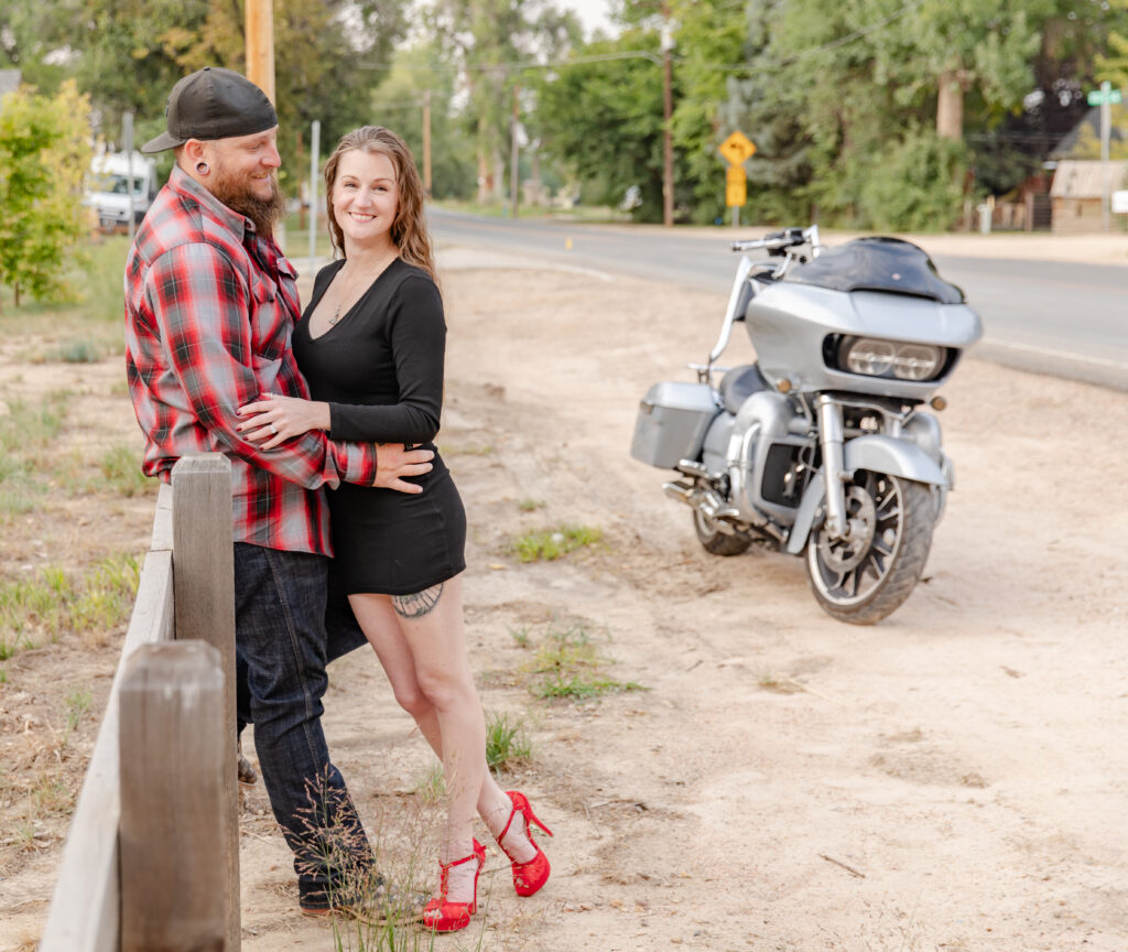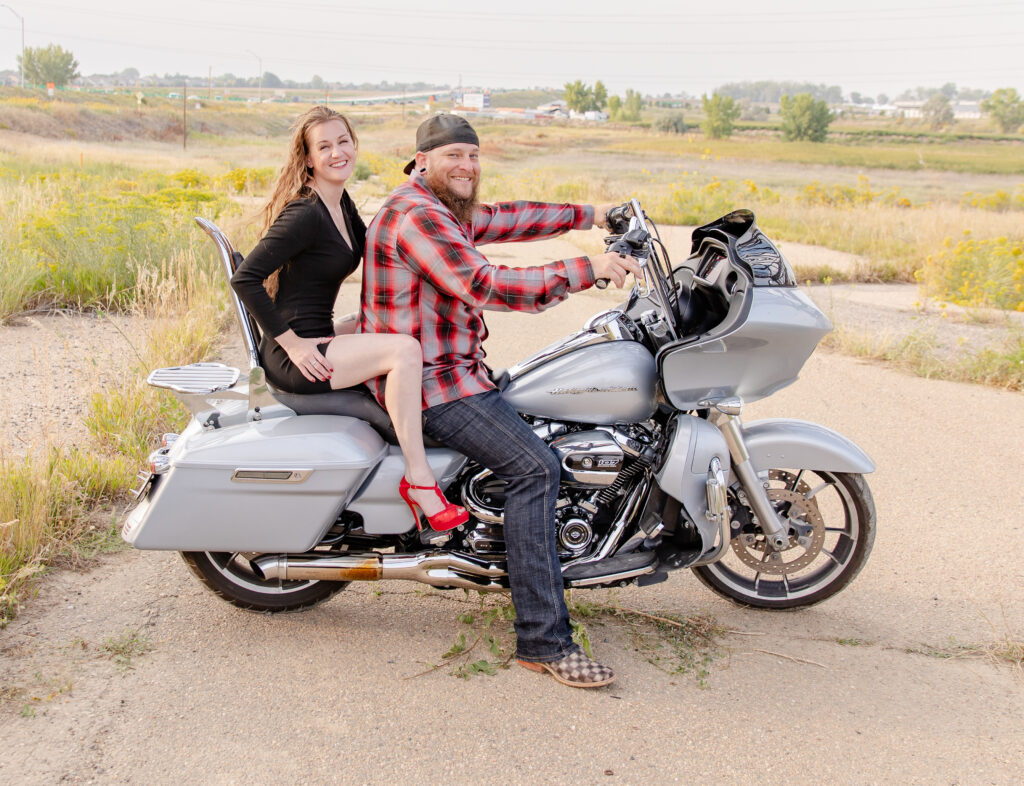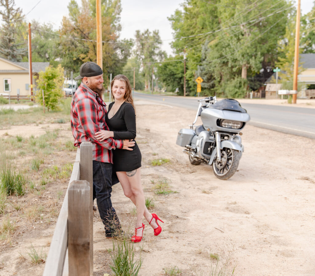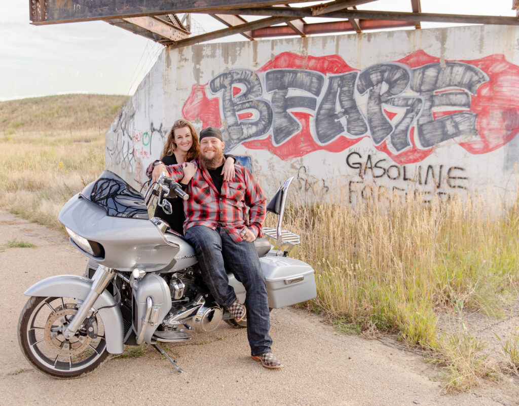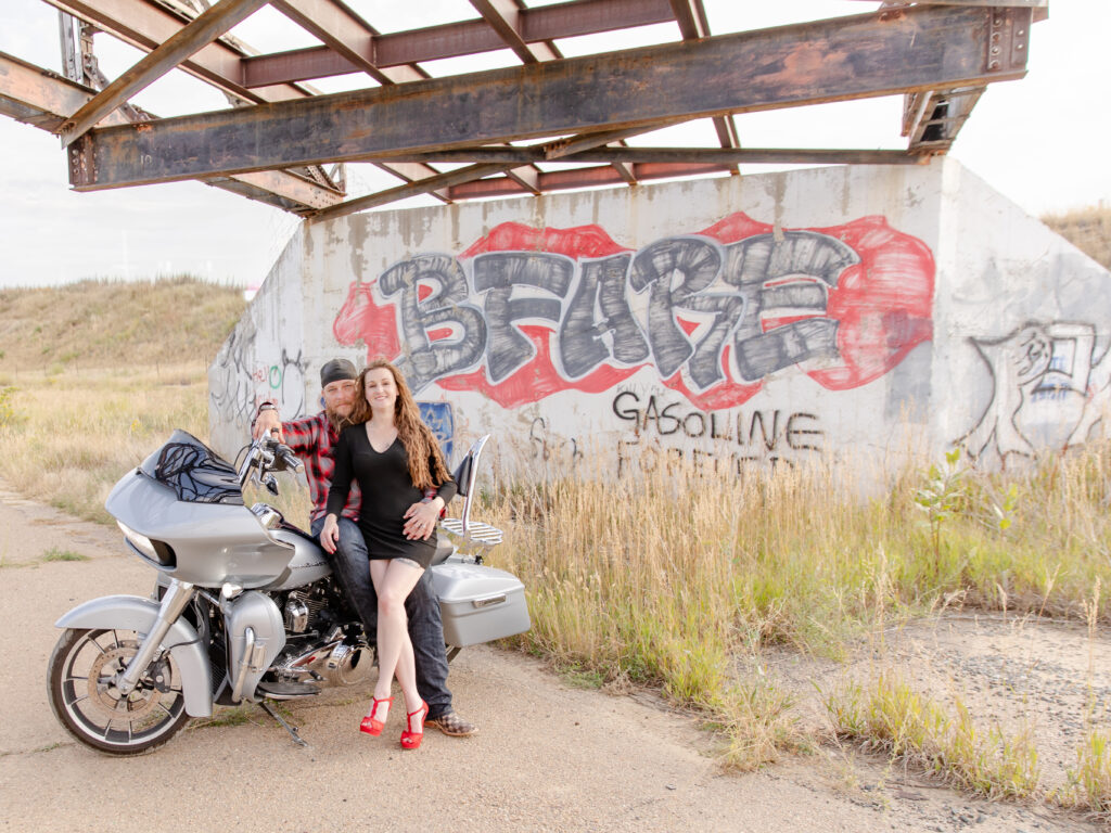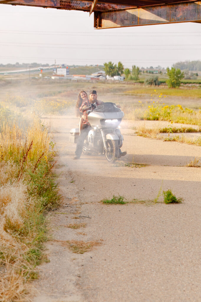 It was a beautiful Saturday evening in early September. The weather was warm with a slight breeze. Eager to meet Steven and Shannel in person I hurry to our first location. As I drove to the abandoned racetrack in the small town of Mead, Colorado I thought “Wow, what a perfect night for an engagement shoot.” Looking into the rearview mirror I catch a glimpse of Steven on his Harley with his gorgeous bride to be following. I knew tonight’s shoot would be a memorable one!
