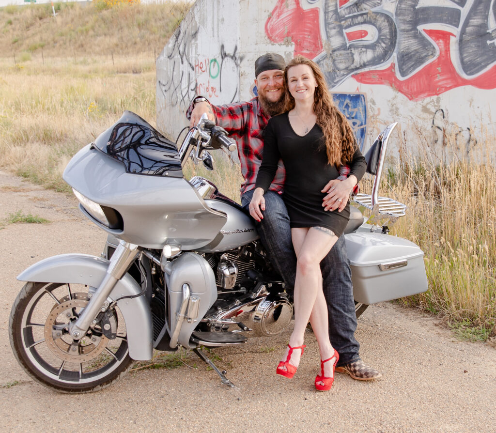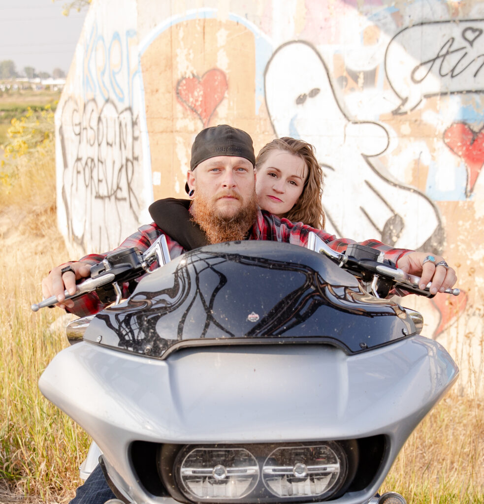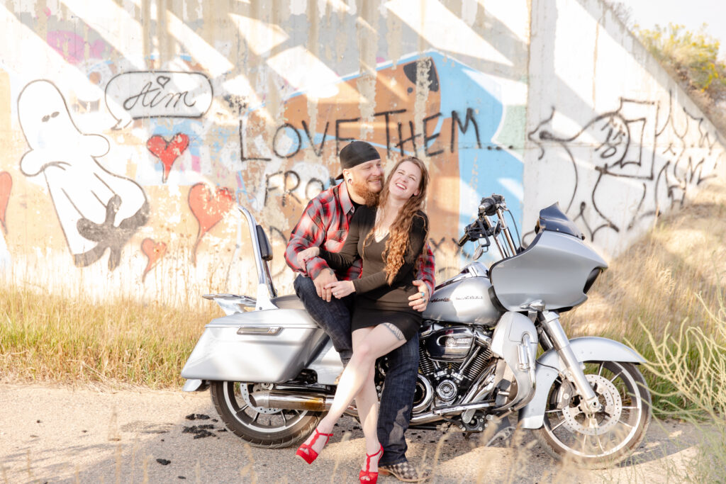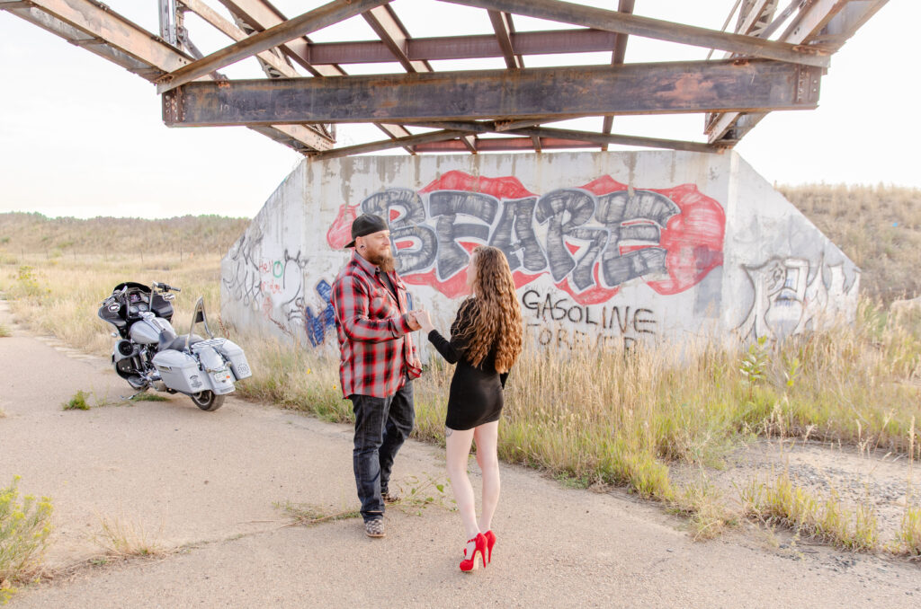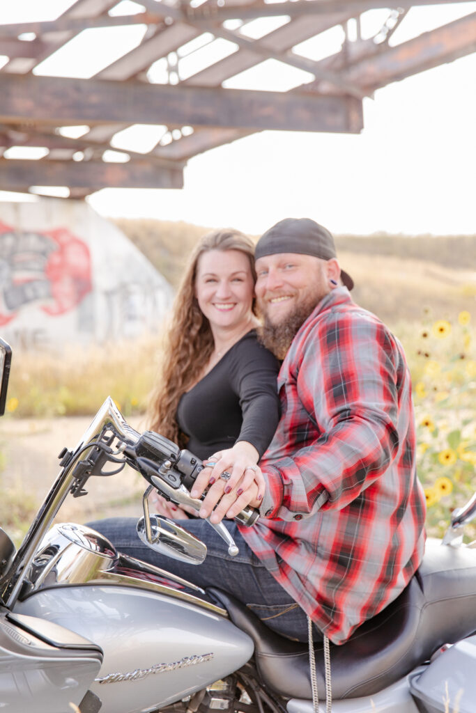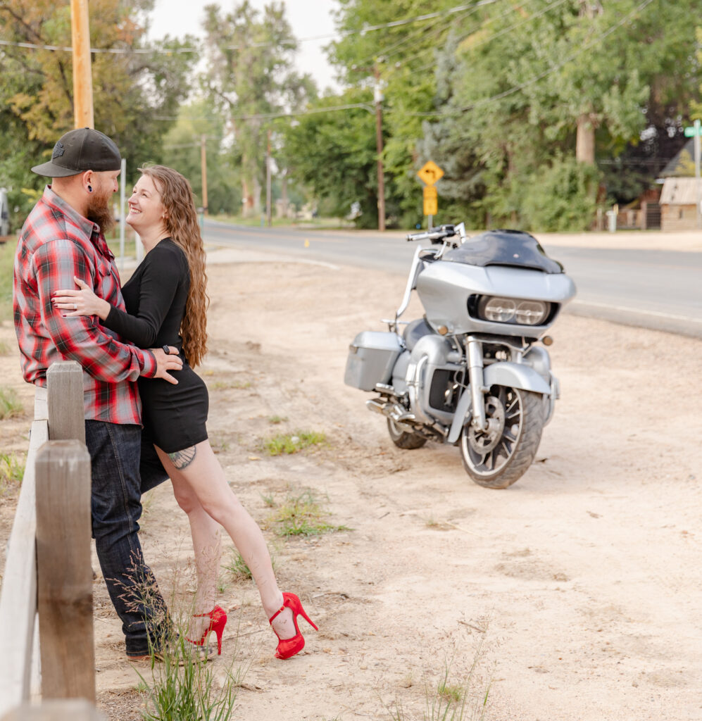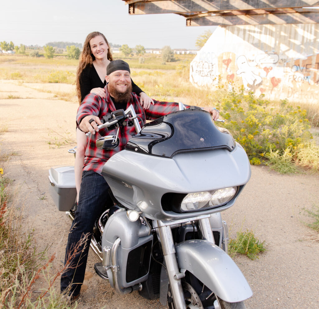It was a beautiful Saturday evening in early September. The weather was warm with a slight breeze. Eager to meet Steven and Shannel in person I hurry to our first location. As I drove to the abandoned racetrack in the small town of Mead, Colorado I thought “Wow, what a perfect night for an engagement shoot.” Looking into the rearview mirror I catch a glimpse of Steven on his Harley with his gorgeous bride to be following. I knew tonight’s shoot would be a memorable one!
