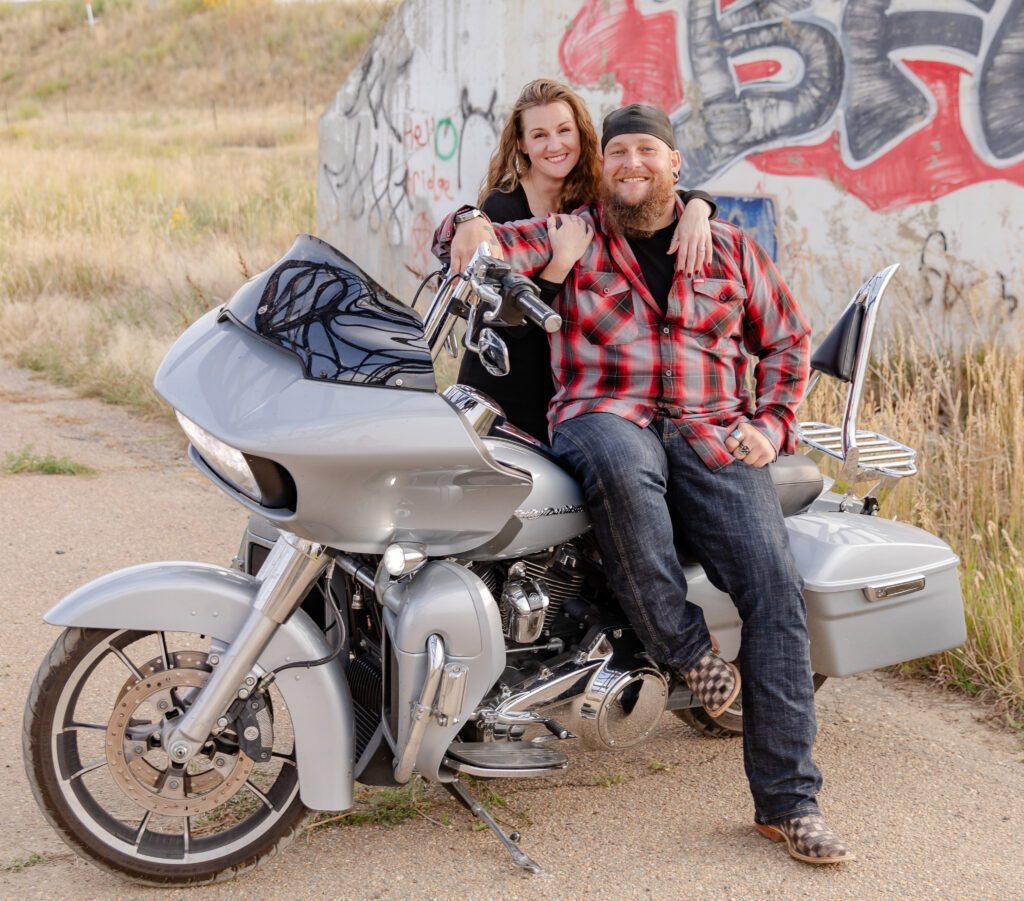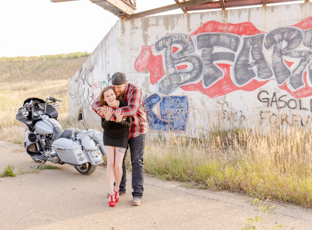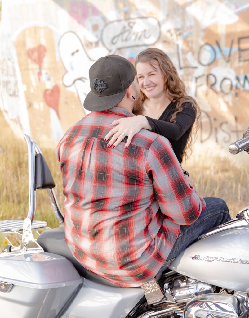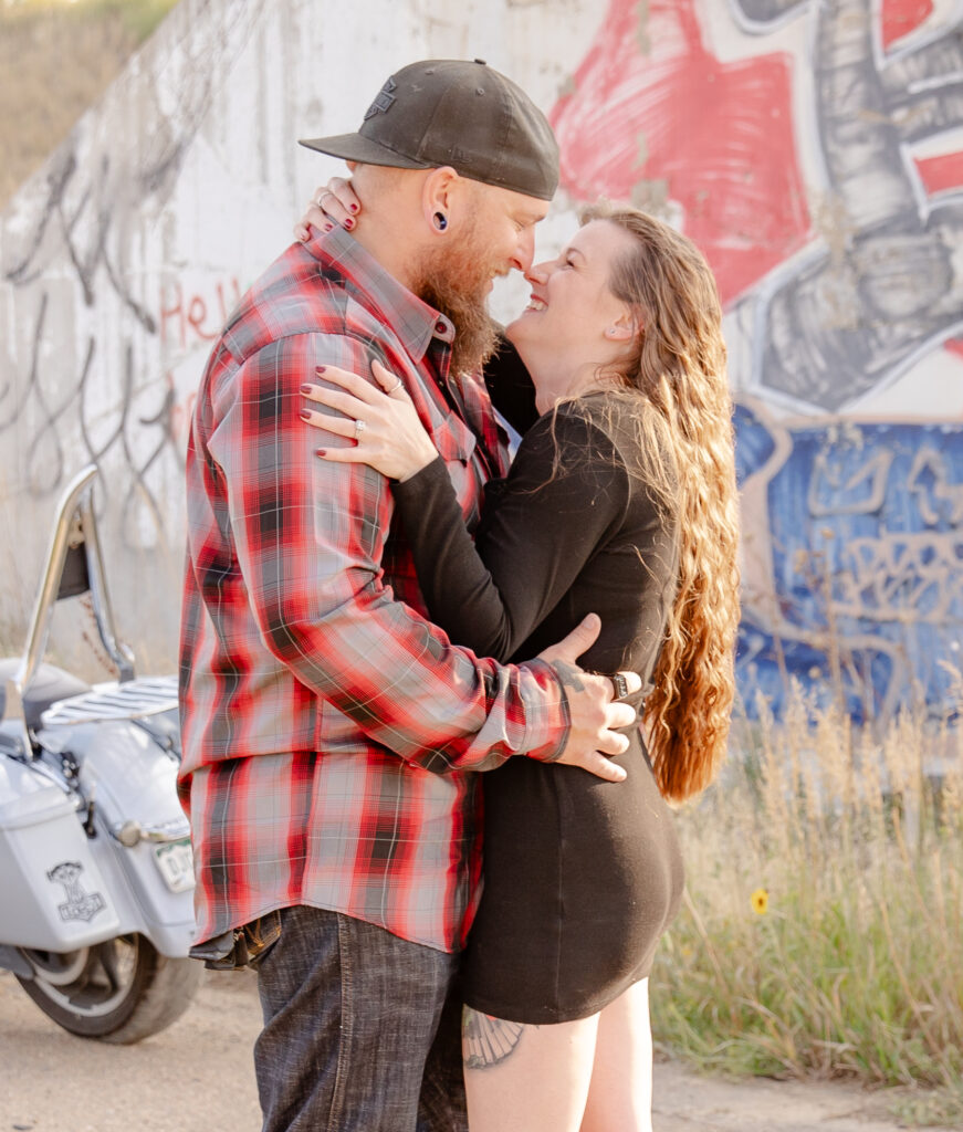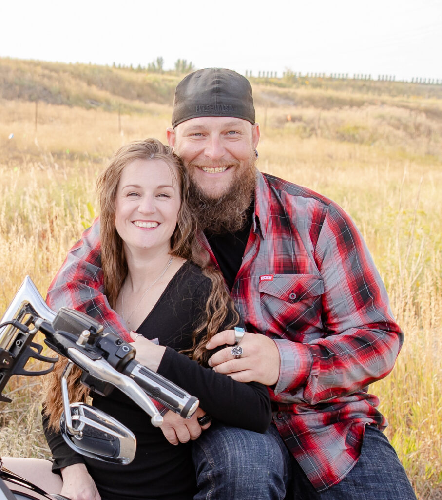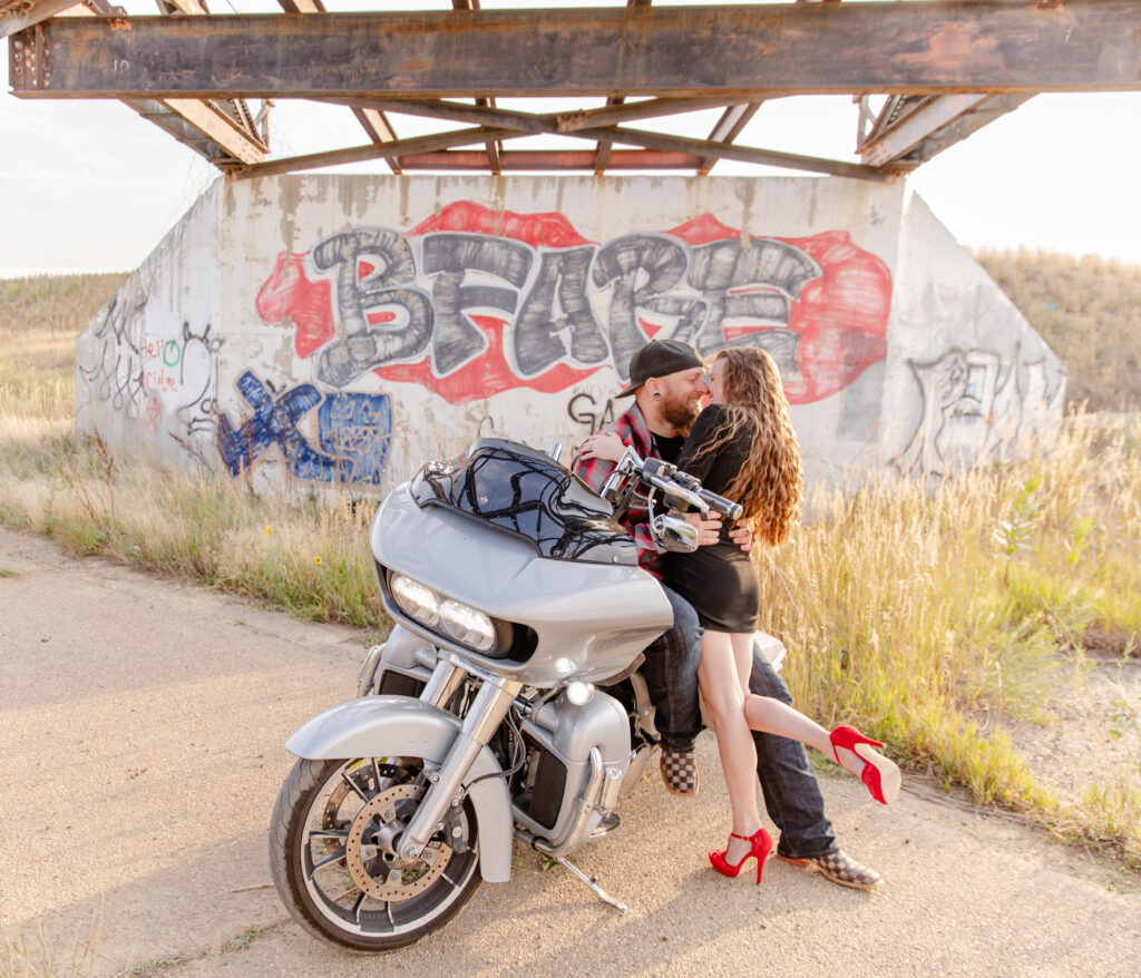 It was a beautiful Saturday evening in early September. The weather was warm with a slight breeze. Eager to meet Steven and Shannel in person I hurry to our first location. As I drove to the abandoned racetrack in the small town of Mead, Colorado I thought “Wow, what a perfect night for an engagement shoot.” Looking into the rearview mirror I catch a glimpse of Steven on his Harley with his gorgeous bride to be following. I knew tonight’s shoot would be a memorable one!