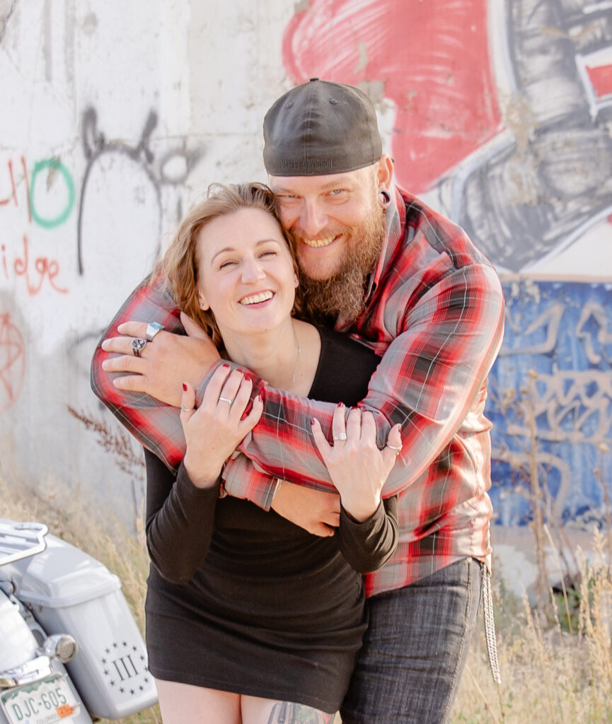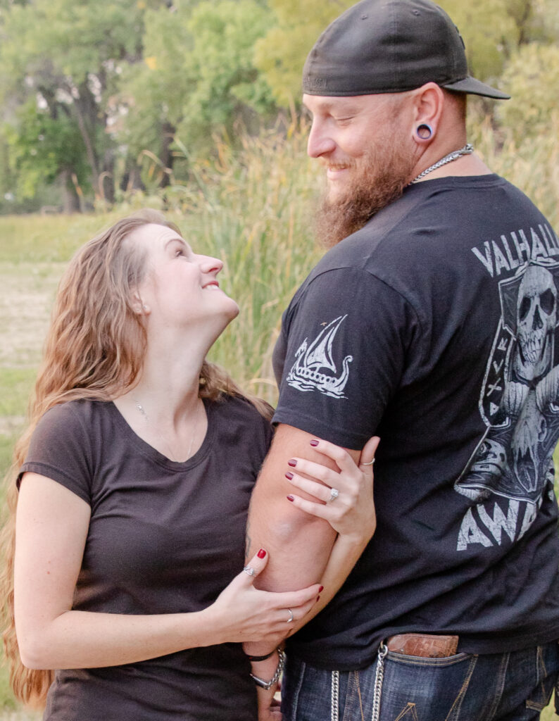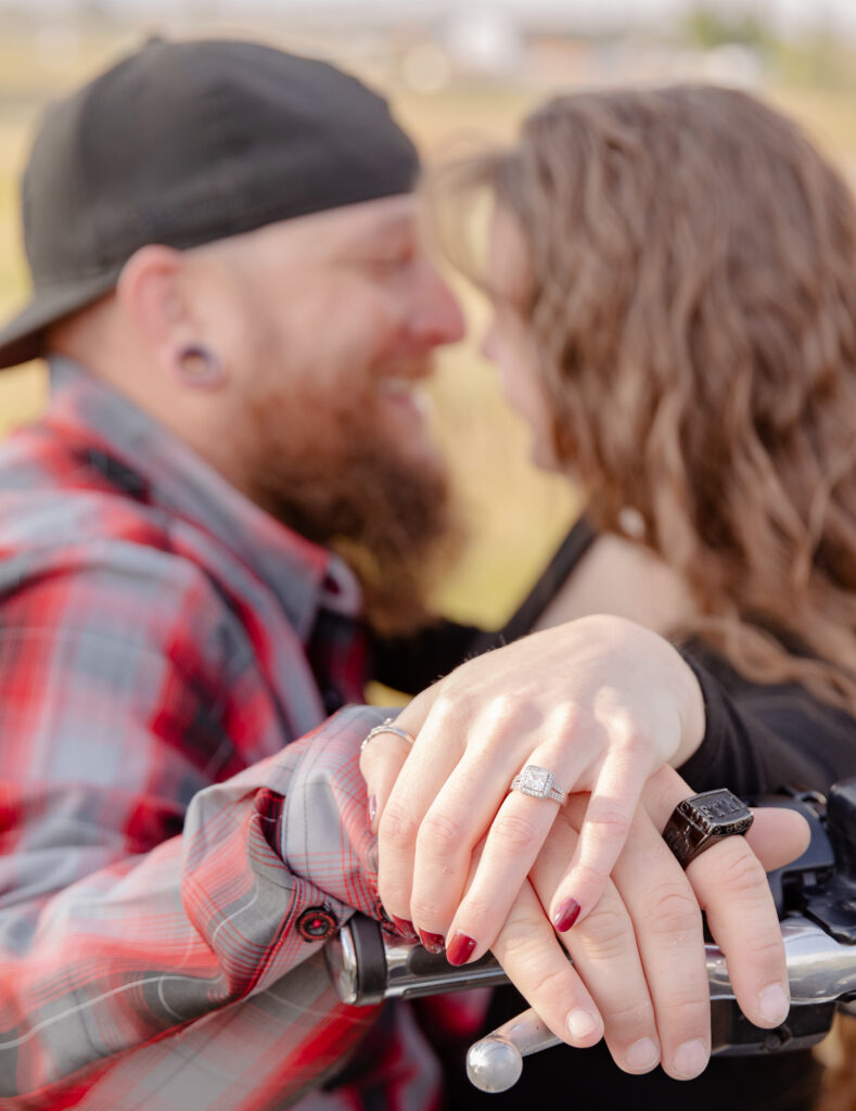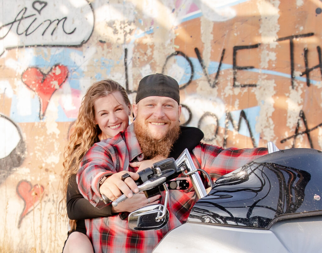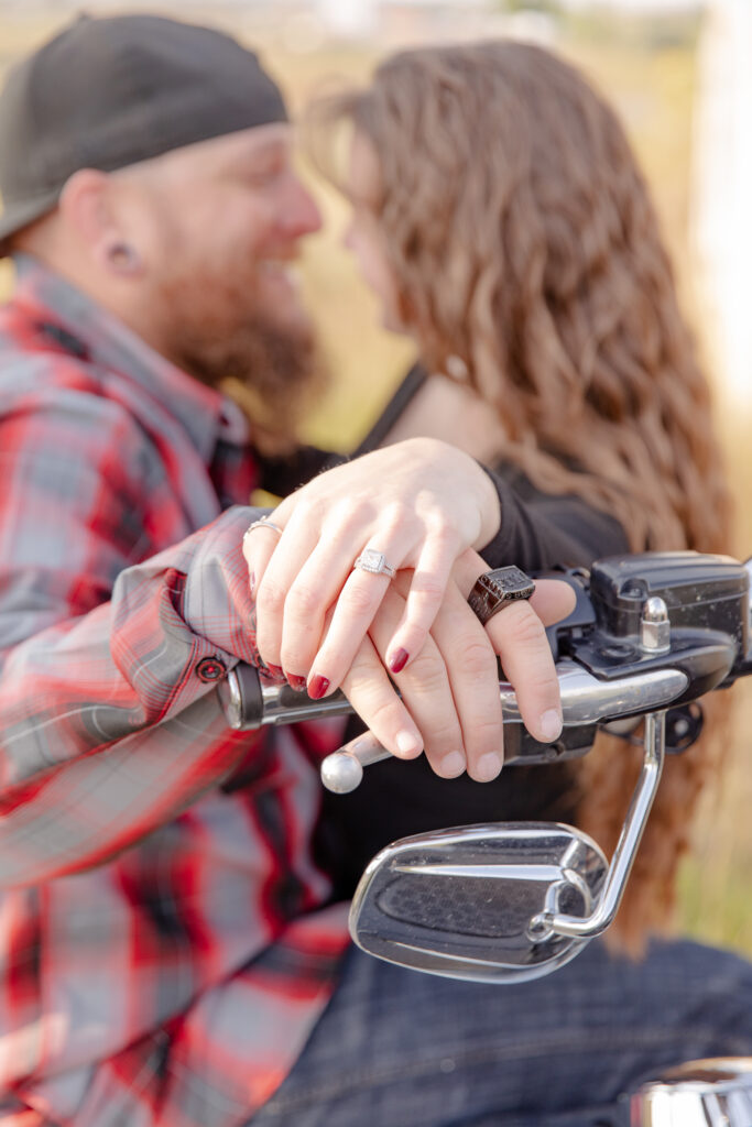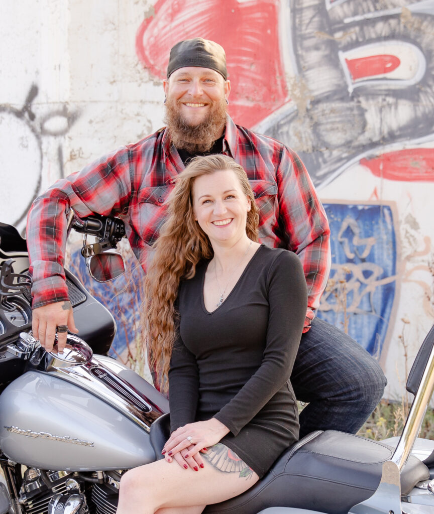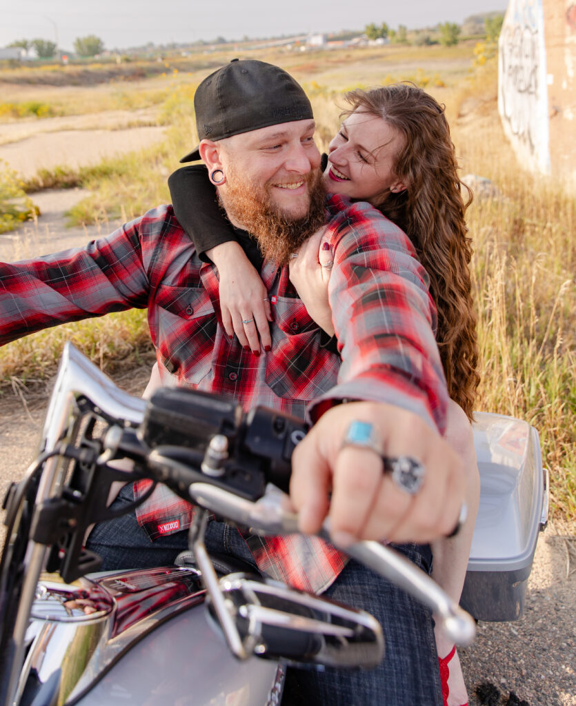 It was a beautiful Saturday evening in early September. The weather was warm with a slight breeze. Eager to meet Steven and Shannel in person I hurry to our first location. As I drove to the abandoned racetrack in the small town of Mead, Colorado I thought “Wow, what a perfect night for an engagement shoot.” Looking into the rearview mirror I catch a glimpse of Steven on his Harley with his gorgeous bride to be following. I knew tonight’s shoot would be a memorable one!
