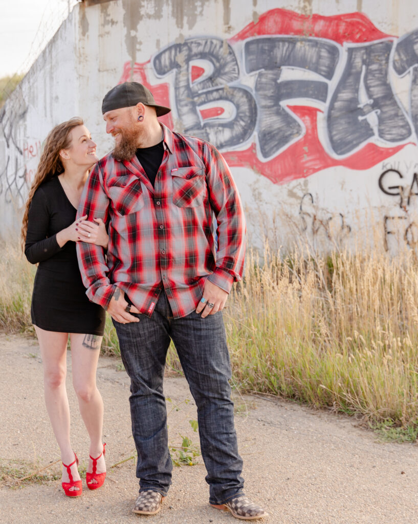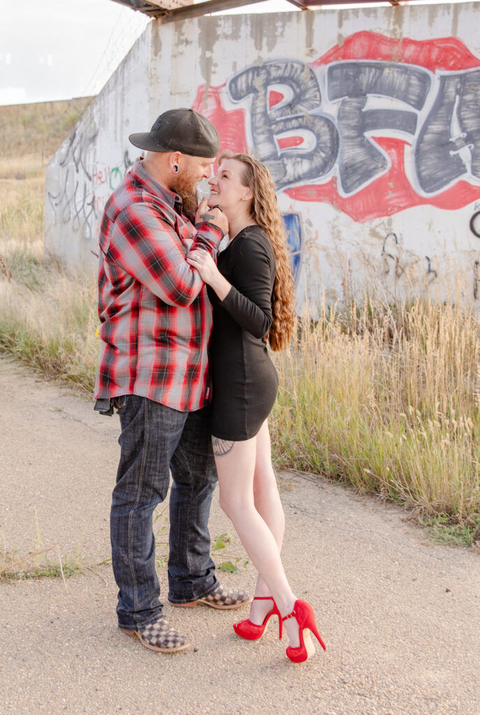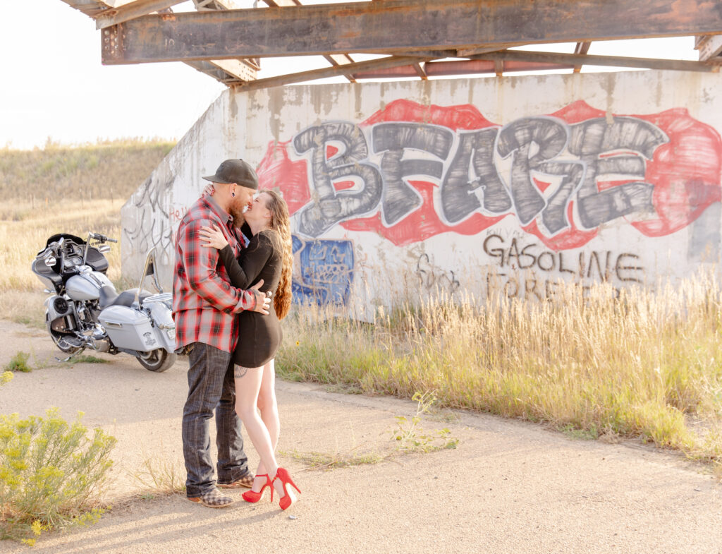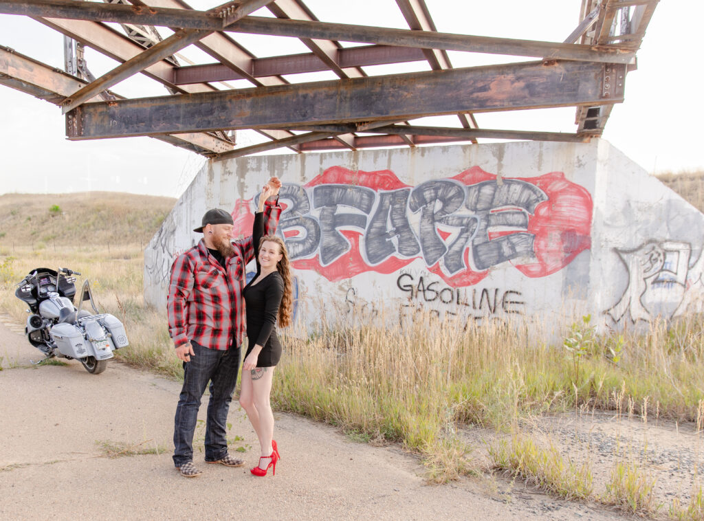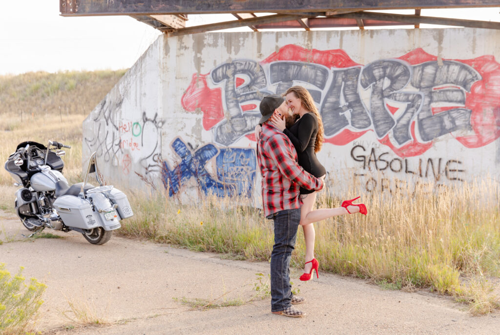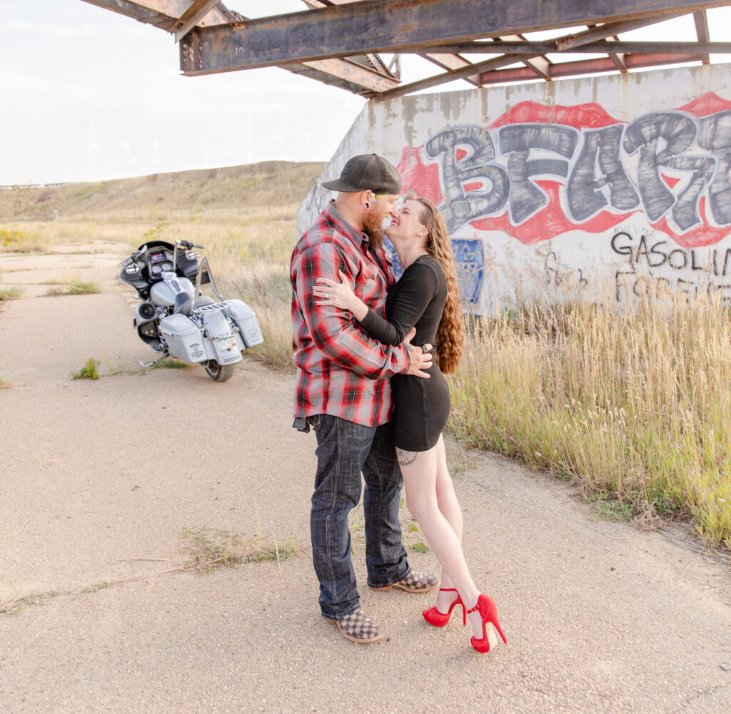 When Shannel and I talked about their ideal location and she expressed interest in the abandoned racetrack, it was an absolute yes! How fun would it be to actually stop and pull out my camera to shoot there. I have driven past this abandoned track several times when I lived in Mead, but never once have I stopped until today when that became a reality. What a perfect start to what will be a fun night, filled with smiles, music, sexy red heels, dancing and laughter. If you have the chance to do a photoshoot with a fun couple and their Harley, DO IT! You will not be disappointed!